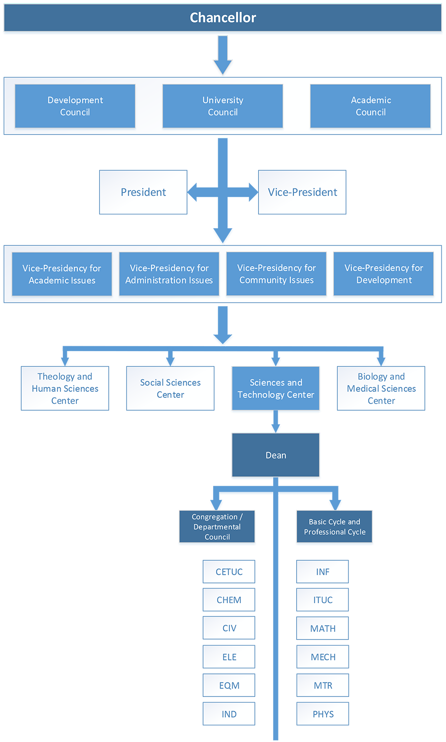 The Center of Science and Technology (CTC) has an administrative structure similar to the other three university centers. It is led by a Dean, elected by faculty, and Vice Deans (Undergraduate, Graduate, and Development) appointed by the Dean. Departments operate autonomously, headed by Department Chairs and Course Coordinators elected by their peers. Academic and administrative decisions are made through committees and task forces.
